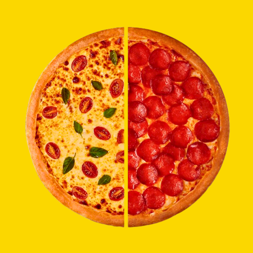 Molho de tomate artesanal, mussarela, frango, calabresa, presunto, cebola, milho e orégano.